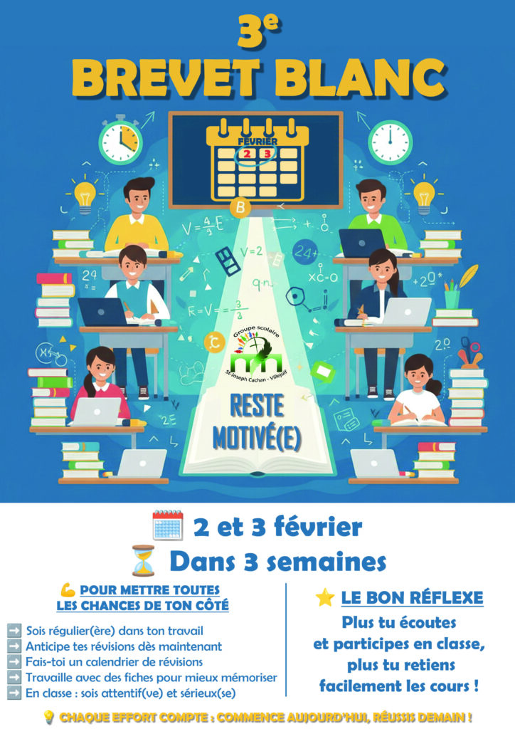 Nos élèves de 3e entrent dans une phase de révision pour aborder sereinement les épreuves du premier brevet blanc de l’année, qui aura lieu lundi 2 et mardi 3 février 2026.